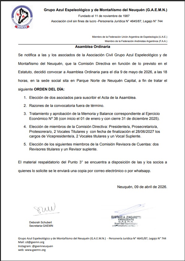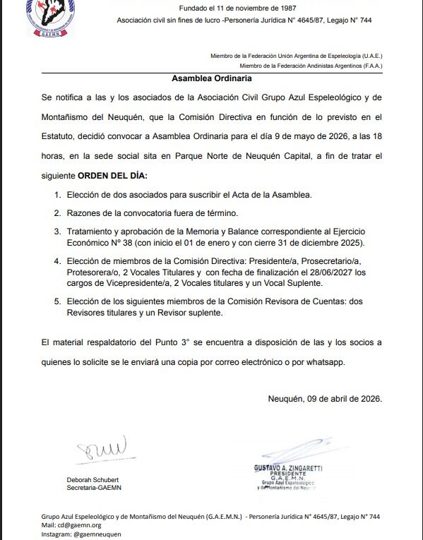 Se notifica a las y los asociados de la Asociación Civil Grupo Azul Espeleológico y de Montañismo del Neuquén, que la Comisión Directiva en función de lo previsto en el Estatuto, decidió convocar a Asamblea Ordinaria para el día 9 de Mayo de 2026, a las 18 horas, en la sede social cita en Parque Norte de Neuquén Capital, a fin de tratar el siguiente ORDEN DEL DÍA: